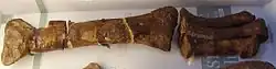 Megalosaurus may have been the first non avian dinosaur to be described in the scientific literature. The earliest possible fossil of the genus, from the Taynton Limestone Formation, was the lower part of a femur, discovered in the 17th century. Part of a bone was recovered from the Taynton Limestone Formation of Stonesfield limestone quarry, Oxfordshire in 1676. Sir Thomas Pennyson gave the fragment to naturalist Robert Plot, who published a description and illustration in his Natural History of Oxfordshire in 1676.[6] It was the first illustration of a dinosaur bone published.[7] Plot correctly identified the bone as the lower extremity of the thighbone or femur of a large animal and he recognized that it was too large to belong to any species known to be living in England. He therefore at first concluded it to be the thigh bone of a Roman war elephant and later that of a giant human, such as those mentioned in the Bible.[8] The bone has since been lost, but the illustration is detailed enough that some have since identified it as that of Megalosaurus.[9]