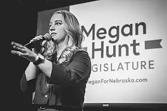 Megan Catherine Hunt (born May 9, 1986) is an American politician serving as a member of the Nebraska Legislature.[1] Hunt represents the 8th legislative district in Omaha, consisting of the midtown neighborhoods of Dundee, Benson, and Keystone. She succeeded term-limited Nebraska State Senator Burke Harr.[2] She identifies as bisexual,[1] and was the first openly LGBT person elected to the state legislature of Nebraska,[3] as well as the first woman to represent the 8th district.[4]