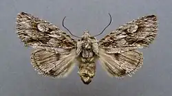 Forewing whitish grey, speckled with darker scales, the shadings olive brownish, this colour filling up the outer half of median area between subcostal vein and submedian fold; a thick dark streak from base below cell; inner line double, oblique and angulated, darker externally; outer line lunulate-dentate, double; stigmata all large, rounded, pale grey with darker dusting, the reniform externally white, with a black line along its base above the median. vein; veins towards termen black-dotted, the intervals on margin with redbrown dentate markings, the submarginal line with a rufous dentate shade before it, crossed by a diffuse dark shade on submedian fold; hindwing pale and darker grey; a large cell blotch and blotch at margin on submedian fold blackish; an obscure darker outer line; marginal area pale grey. Larva brown, darker in front; dorsal line narrow, pale, with 4 white tubercles on each side; lateral lines waved, darkedged above, paler below; 11th segment with a two-pointed hump.[4] The wingspan is 50–58 mm.