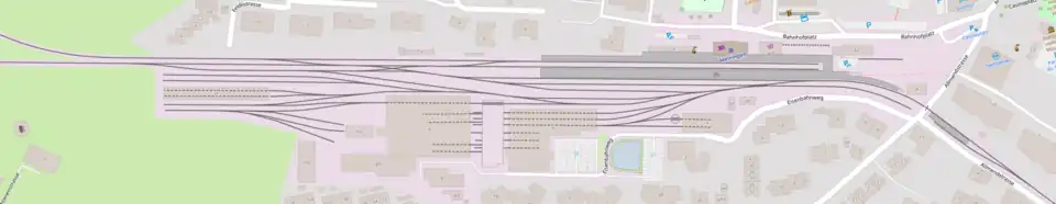 All trains on the Brünig line enter and leave the station at its western end, and must reverse in the station to continue their journey. Immediately to the west of the station is a junction and trains heading to Interlaken continue westwards down the valley of the Aare, whilst trains heading to Lucerne turn to the north and commence their climb to the Brünig Pass. The line up to the Brünig Pass is equipped with rack rails, and Meiringen is the furthest station from Interlaken that can be served by trains not fitted with rack equipment.[2]