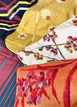 Meisen (銘仙, lit. 'common silk stuff') is a type of silk fabric traditionally produced in Japan; it is durable, hard-faced, and somewhat stiff, with a slight sheen,[1]: 79 and slubbiness is deliberately emphasised.[2] Meisen was first produced in the late 19th century,[3] and became widely popular during the 1920s and 30s (late-Taishō to early-Shōwa period), when it was mass-produced[2] and ready-to-wear kimono began to be sold in Japan.[4] Meisen is commonly dyed using kasuri (Japanese ikat) techniques, and features what were then overtly modern, non-traditional designs[5] and colours.[2] Meisen remained popular through to the 1950s.[2]
