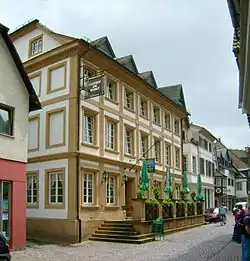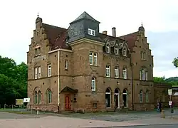 Left over from the Schloss (palatial residence), formerly held by the Counts of Veldenz and later the Dukes of Palatine Zweibrücken, extensively renovated in the 15th century but beset with fire in the 18th century and a round of demolition in the 19th, is only one major building, the Magdalenenbau, which was built in 1614 as a residence for Magdalena, the Ducal Zweibrücken widow, and considerably remodelled in the 19th century by the Landgraves of Hesse-Homburg. It is nowadays used by the Evangelical Church and hence also bears the name Herzog-Wolfgang-Haus (“Duke Wolfgang House”) after the Duke who lent the Reformation considerable favour.
