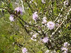 The flowers are mauve and are arranged in heads or spikes to 16 mm (0.6 in) in diameter, with 5 to 15 individual flowers. The petals are 1.5–2.4 mm (0.06–0.09 in) long and fall off as the flowers open. The stamens are arranged in five bundles around the flower with 9 to 16 stamens in each bundle. Flowering occurs from September to November and the fruit are woody capsules, 2.5–3.5 mm (0.098–0.14 in) long.[3]