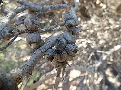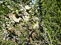 The flowers are arranged in groups of 1 to 5 along considerable lengths of the branches. The petals and sepals have edges that are almost transparent and the petals fall from the flower soon after it opens. The stamens are white or cream and arranged in five bundles around the flower, each bundle having the appearance of a claw. Flowering time is variable but is usually between August and January. The fruit are almost spherical, knobbly, woody capsules that are larger than those of most other melaleucas at about 10 mm (0.4 in) diameter.[2][3]