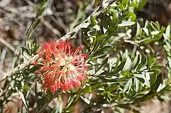 The flowers are crimson and arranged in spikes on side branches, the spikes up to 60 mm (2 in) long and about 50 mm (2 in) in diameter. Each spike contains between 10 and 80 individual flowers. The petals are 3–6 mm (0.1–0.2 in) long and fall off as the flowers open. The stamens are arranged in five bundles around the flower, each bundle with 15 to 25 stamens. Flowers appear mostly from February to December varying somewhat with subspecies. The fruit are woody, roughly spherical capsules about 6 mm (0.2 in) in diameter, forming clusters along the branches.[2][3]