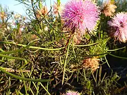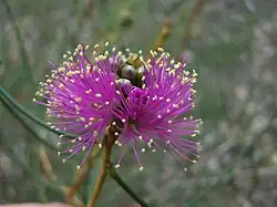 The flowers are a shade of pink to purple and are arranged in heads on the ends of most of the branches, which continue to grow after flowering. The heads are up to 55 mm (2 in) in diameter but more usually about half that size, and contain 10 to 20 groups of flowers in threes. The stamens are in five bundles around the flower, each bundle with 7 to 13 stamens. Flowering usually occurs in September or October and the fruit which follow are woody capsules 3–6 mm (0.1–0.2 in) long in roughly spherical clusters along the stems.[2][3]