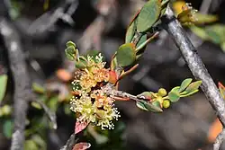 The flowers are white, in small heads up to 6 mm (0.2 in) in diameter and contain 2 to 8 flowers. The petals are 1–1.4 mm (0.04–0.06 in) long and fall off as the flowers mature. The stamens are arranged in five bundles around the flower, each bundle with 2 to 7 stamens. Flowers appear in summer and are followed by fruit which are woody capsules 1.5–2 mm (0.06–0.08 in).[2][3]