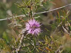 The flowers are pinkish to purple and are arranged in heads on the ends of branches which continue to grow after flowering and sometimes also in the upper leaf axils. The heads are up to 17 mm (0.7 in) in diameter with 4 to 12 groups of flowers in threes. The petals are 1.0–1.5 mm (0.04–0.06 in) long and fall off as the flower matures. The outer surface of the floral cup (the hypanthium) is hairy and there are five bundles of stamens around the flower, each with 3 to 6 stamens. Flowering occurs from July to October and is followed by fruit which are woody capsules, 2.5–3.0 millimetres (0.098–0.12 in) long, packed tightly together in spherical or oblong clusters.[2][3]