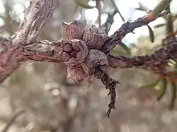 The stamens of the flowers are white but the petals are pink or red. The flowers are arranged in heads or short spikes on the ends of branches which continue to grow after flowering and sometimes also in the upper leaf axils. The heads are up to 18 mm (0.7 in) in diameter and contain 4 to 11 individual flowers. The petals are 1.5–1.8 mm (0.06–0.07 in) long and fall off as the flower ages. The stamens are arranged in five bundles around the flowers and there are 3 to 13 stamens per bundle. The main flowering period is in September and October and is followed by fruit which are woody capsules 3–4.5 mm (0.1–0.2 in) long forming loose clusters along the stems.[2][3]