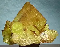 Melanophlogite is a rare mineral which usually forms round drops (see infobox) or complex intertwinned overgrowth structures over sulfur or calcite crystals. Rarely, it occurs as individual cubic crystallites a few millimeters in size.[2] It is found in Parma, Torino, Caltanissetta and Livorno provinces of Italy; also in several mines of California in the US, in Crimea (Ukraine) and Pardubice Region (Czech Republic).[5]