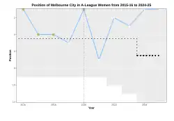 The club created history in its inaugural 2015–16 season, winning all 12 of its regular season games to become Premiers (regular-season winners) and becoming Champions by winning the 2016 W-League grand final, completing a perfect season.[8] In the following season, City suffered a six-match winless run during the middle part of the season before storming back into the finals series and claiming a second successive championship in the 2017 grand final. This achievement meant the club was equal with several other clubs for the greatest number of championships won in the league.[9] The club then eclipsed this record the following season when it defeated Sydney FC in the 2018 W-League grand final making it 3 championships in a row.[10][11]