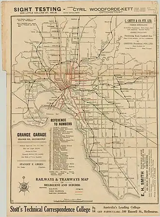 Although the first electric tram service was introduced in 1889, and ran for seven years between the outer Melbourne suburbs of Box Hill and Doncaster, the electric tram network did not seriously commence until 1906, when the Victorian Railways built an "Electric Street Railway" from St Kilda railway station to Brighton, and The North Melbourne Electric Tramway & Lighting Company built an electric tramway towards Essendon from the terminus of the cable system.[4] From 1924 the cable tram lines were progressively converted to electric traction. The last Melbourne cable tram ran on 26 October 1940, on the Northcote to Bourke Street route.[5] Three routes were converted to bus rather than electrified. The cable tram routes were generally folded into the existing electric routes, creating the basis for the system still in use today.