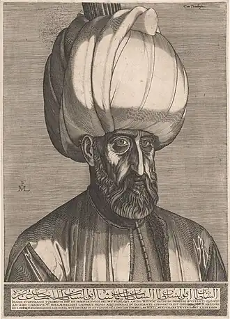 While in Vienna, Melchior Lorck was contacted both by the brother of the late king Christian III, duke Hans the Elder of Schleswig-Holstein-Haderslev who demanded his service. Lorck responded willingly, but was eager to excuse himself for being too busy. While finally answering the duke in January 1563, he also sent King Frederik II a letter, containing a lengthy description of his career up to the date.[6] In 1562 Melchior Lorck had produced the large engraved bust portraits of Sultan Suleiman the Magnificent and the Persian envoy in Constantinople, Ismaïl, which he added to his letters. In the letters, Melchior Lorck asked for funding, which effected a gracious royal gift of 200 Danish rigsdaler, to be handed over to him via his brother, Andreas Lorck, who had himself recently stepped into the king's service in Copenhagen.