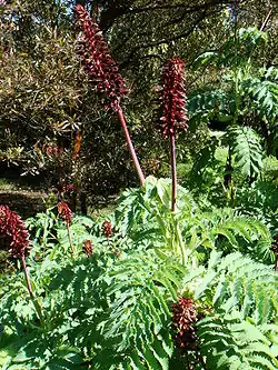 Melianthus major, the giant honey flower or kruidjie-roer-my-nie (Afrikaans for 'herb-touch-me-not'), is a species of flowering plant in the family Francoaceae. It is an evergreen suckering shrub, endemic to South Africa and naturalised in India, Australia and New Zealand.[1][2] It grows to 2–3 m (7–10 ft) tall by 1–3 m (3–10 ft) wide, with pinnate blue-green leaves 30–50 cm (12–20 in) long, which have a distinctive musky odour. Dark red, nectar-laden flower spikes, 30–80 cm (12–31 in) in length, appear in spring, followed by green pods.[1][3] All parts of the plants are poisonous.[2]