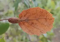 Melikaiella flora, formerly Callirhytis milleri, the live oak petiole gall wasp, is a species of hymenopteran that produces leaf galls on coast live oak, interior live oak, and canyon live oak trees in California in North America.[1][2] The gall often subsumes the entire petiole and occasionally part of the leaf body.[1] Pregnant females of the second generation oviposit on acorns; these acorns are usually dropped by the tree and become food for squirrels, deer, Steller's jays, etc.[1]