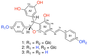 - ^ Iliya, Ibrahim; Ali, Zulfiqar; Tanaka, Toshiyuki; Iinuma, Munekazu; Furusawa, Miyuki; Nakaya, Ken-ichi; Murata, Jin; Darnaedi, Dedy (2002). "Four New Stilbene Oligomers in the Root of Gnetum gnemon". Helvetica Chimica Acta. 85 (8): 2538–46. doi:10.1002/1522-2675(200208)85:8<2538::AID-HLCA2538>3.0.CO;2-J.