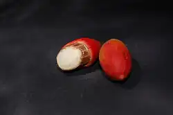 The oval fruit (technically a strobilus) measures 1–3.5 cm long, it consists of a thin velvety integument and a large nut-like endosperm 2–4 cm long inside. Fleshy strobili weigh about 5.5 g, the endosperm alone 3.8 g. It changes colour from yellow to orange, purple or pink when ripe.[5] Melinjo season in Indonesia comes three times in March to April, June to July, and September to October,[4] but the fruiting season in northeast of Philippines mainly from June to September.