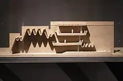 The top lighting inside the building was inspired by the skylights in Isfahan's bazaar which Utzon had visited in 1959. Based on Aalto's project for an art gallery in Baghdad, the roof is articulated with folded-plate beams of various depths allowing the light to enter though narrow slits before being deflected by the deep V-shaped troughs. Utzon wanted the concrete flank walls to be left partially uncovered but shortly after his involvement ended, they were completely clad with travertine. Similarly, the rough perforated brick Utzon had prescribed for improving the acoustics inside the building was replaced with American acoustic panels.[2] The structure is designed to provide complete flexibility in the organization of spaces.[1]