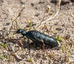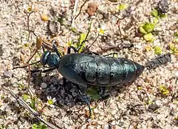 Meloe americanus is a type of blister beetle (Meloidae) found in North America. It is most relevant to the fields of agriculture and veterinary medicine.[1] Adult beetles feed on different types of plants, which cause crop damage.[2] They also release a fluid containing a chemical that is toxic, and at high concentrations lethal, to mammals.[3] The first instar larvae are uniquely active and mobile, utilizing phoresy and parasitism to feed and mature through their developmental stages.[2]