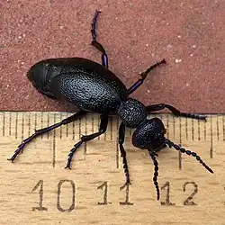 Meloe proscarabaeus is a European oil beetle. It lives in meadows, field margins and other warm sites in all but the far north of the continent. It lacks hind wings and the elytra are correspondingly reduced in size.