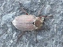 Melolontha hippocastani, the northern cockchafer,[1] is a species of scarab beetle native to Eurasia, with its range spanning from Western Europe to the Pacific coast of China. It is one of several species in the genus Melolontha known as cockchafers, alongside the common cockchafer (Melolontha melolontha) and Melolontha pectoralis,[2] but generally at more northern latitudes, or at higher altitudes in upland woods further south.[1] The adults are around 20–29 mm in length. It is distinguished from Melolontha melolontha by the shape of its pygidium, which is primarily black in colour. It primarily dwells in forests, and as such is also known as the forest cockchafer. The mate-finding behaviour in M. hippocastani is facilitated by plant volatiles and sex pheromones. Mating activities primarily takes place during the evening flight periods.[3] Females lay their eggs in soil, and the larvae feed on decaying organic matter and later small plant roots, including the roots of young trees like pines and firs. The larvae usually develop between 3 and 5 years. They emerge between late April and the end of June.[4] Like other cockchafers, they have been considered a serious pest of crops and trees.[1]