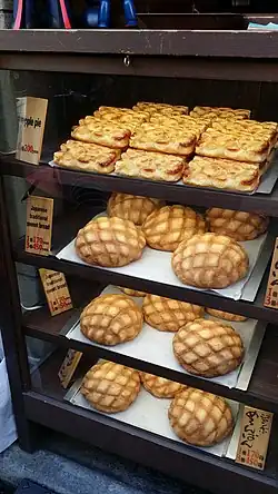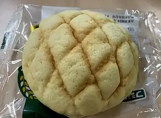 Melonpan (メロンパン, meronpan), also called melon bun or melon bread, is a Japanese sweetbun covered in a layer of crispy cookie dough. The texture resembles that of a melon, such as a cantaloupe. It is not traditionally melon-flavored.[1]