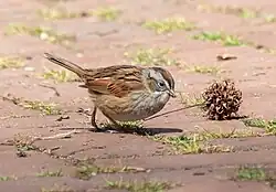 Members of Melospiza are medium-sized sparrows with long tails, which are pumped in flight and held moderately high on perching. They are not seen in flocks, but as a few individuals or solitary. They prefer brushy habitats, often near water.