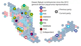 This is a list of the members of the Dewan Rakyat (House of Representatives) of the 13th Parliament of Malaysia.[3] The opposition coalition Pakatan Rakyat that contested the general elections in 2013 was dissolved after series of disagreements between two main parties, Democratic Action Party (DAP) and Pan-Malaysian Islamic Party (PAS).[4] A new opposition coalition Pakatan Harapan was formed by the DAP, People's Justice Party (PKR) and newly formed party National Trust Party (AMANAH), consisting of ex-PAS members.[5] Several ex-UMNO members have also formed their own party Malaysian United Indigenous Party (BERSATU) and have signed an electoral pact with Pakatan Harapan to contest the future general election and ensure straight fights against Barisan Nasional.[6] On 20 March 2017 BERSATU officially became a member of Pakatan Harapan.[7]