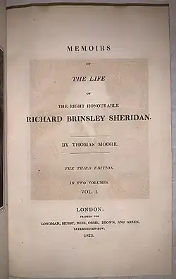 Memoirs of the Life of Richard Brinsley Sheridan was an 1825 biography written by Thomas Moore about the life of the playwright and politician Richard Brinsley Sheridan (1751–1816). It was published after nine years work, on and off, and had been delayed by a legal dispute over the use of Sheridan's papers. It was published in October 1825 by Longmans in two volumes under the full title of Memoirs of the Life of the Right Honourable Richard Brinsley Sheridan.[1]
