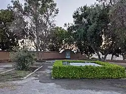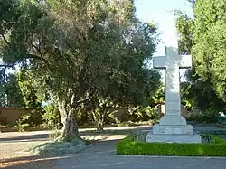 The grounds of Memorial Cross Park are landscaped with oleander and olives, and adobe perimeter walls similar to early mission days bound the site.[26] Low-maintenance grass was installed along the street edge in 2018.[27]