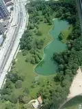![]() Memorial Drive outlined in red runs by the Arch Grounds on both sides of I-44 | |