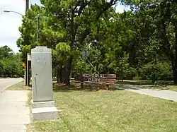 From 1917 to 1923, the land where the park currently exists was the site of Camp Logan, a U.S. Army training camp named after Illinois U.S. Senator and Civil War General John A. Logan.[3] During World War I, the training camp was located on the far west boundaries of Houston. After the war in early 1924, Will and Mike Hogg, purchased 1,503 acres (6.1 km2) of former Camp Logan land and sold the area to the city at cost. In May 1924, the City of Houston took ownership of the land to be used as a "memorial" park, dedicated to the memory of soldiers who lost their lives in the war. The park is adjacent to the Camp Logan, Crestwood, and Rice Military neighborhoods.[4]