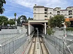 Memorial Park station is a below-grade light rail station on the A Line of the Los Angeles Metro Rail system. It is located at Holly Street and at the end of Arroyo Parkway in Pasadena, California. The station is named after the nearby Memorial Park and is situated on the northern edge of Old Town Pasadena.