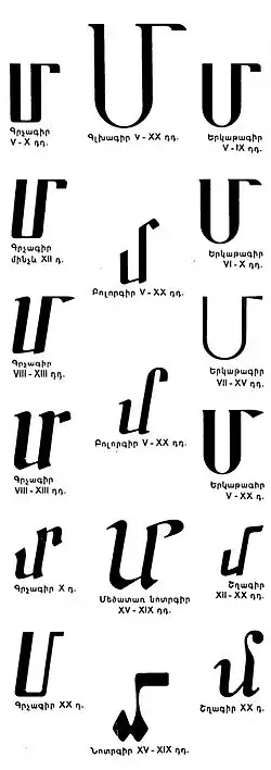Men (majuscule: Մ; minuscule: մ; Armenian: մեն) is the twentieth letter of the Armenian alphabet, representing the bilabial nasal (/m/) in both Eastern and Western Armenian. It is typically romanized with the letter M.[1] It was part of the alphabet created by Mesrop Mashtots in the 5th century CE. In the Armenian numeral system, it has a value of 200.[2]