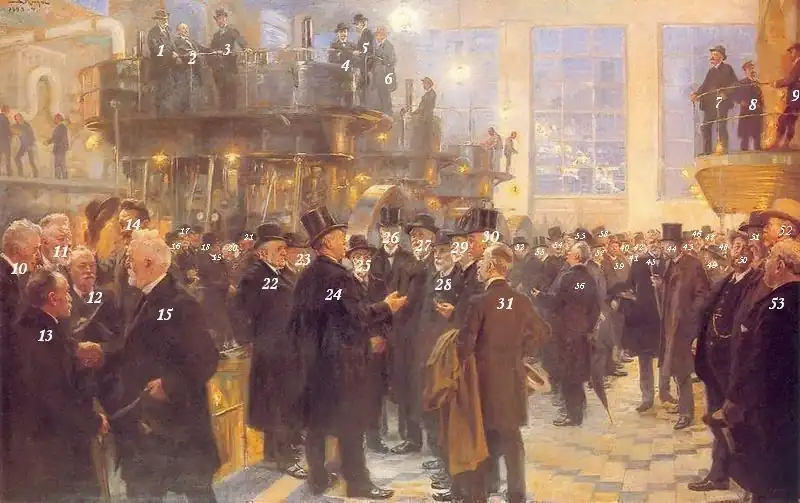 Men of Industry (Danish: Industriens Mænd) is a 1903–1904 oil on canvas group portrait painting by Peder Severin Krøyer (1851–1909) featuring 53 leading representatives of the technical sciences in Denmark during the second half of the 19th century, seen at a fictional gathering at Østerbro Power Station in Copenhagen. The painting was commission by Gustav Adolph Hagemann and is now on display in the Museum of National History at Frederiksborg Castle, Hillerød.