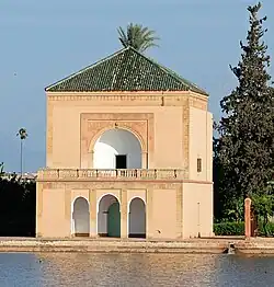 The origin of the name Menara for the gardens is not firmly established. The name's first appearance (as Sahrij al-Manāra) in historical sources is in 1579, during the Saadian period.[3]: 196 [4] The Arabic word menara (منارَة) variously means "minaret", "lighthouse", "lantern/beacon" or other elevated structures of the kind. It is often suggested that this refers to the two-story pavilion standing on the edge of the main reservoir. However, other historians, such as Gaston Deverdun, have suggested that the name could date from as far back as the Almohad period (long before the current pavilion's construction) and that it may be an allusion to the minaret of the Kutubiyya Mosque to the northeast, which was founded and begun under Abd al-Mu'min's reign and with which the gardens were more or less aligned.[5][3]: 197–198