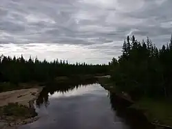 The Menda is a right tributary of the Lena. It is formed at the confluence of the Tala-Kyuyol and Onney-Ulur rivers in the Lena Plateau, between the Lena and the Amga. It heads in a roughly northern direction across taiga areas in its upper and middle course, parallel to the Tamma to the east. Then it bends to the northwest in its lower course, when it reaches the Lena floodplain and flows slowly among the swamps and small lakes of the area. Finally it meets the Lena 1,565 kilometres (972 mi) from its mouth north of the village of Tit-Ebya, south of Yakutsk.[4][2]