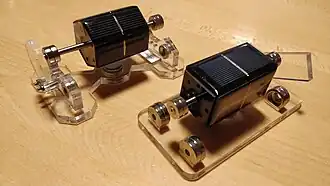The idea of a light-commutated motor, where solar cells power the individual coils of a motor, was first described by Daryl Chapin in an experiment kit from 1962 about solar energy.[1] The kit was distributed by Bell Labs, where Chapin together with his colleagues Calvin Fuller and Gerald Pearson had invented the modern solar cell eight years earlier, in 1954.[4] Chapin's version of the motor uses a vertical glass cylinder on a needle point as a low-friction bearing.