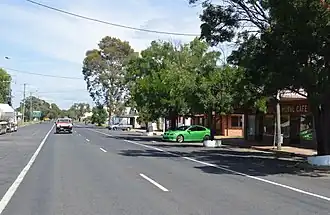 Mendooran (pronunciation: men-door-an) is a small town adjacent to the Castlereagh River in the Warrumbungle Shire of central western New South Wales, Australia. The town lies at an altitude of 271 metres above sea level, 348 kilometres west of Sydney, 75 kilometres from Dubbo and 71 kilometres southeast of Coonabarabran. At the 2021 census, Mendooran had a population of 275 people.[1] The Castlereagh Highway also runs through the town, changing its name to Bandulla Street in the centre.