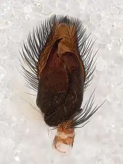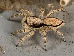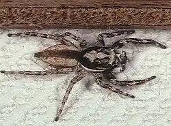 Gray wall jumpers are dorso-ventrally flattened and are covered with short dense, grayish-white hairs. There are tufts of dark brown bristles near the large, forward-facing eyes.[1] The spiders are about nine millimetres long, the male being slightly smaller than the female. The male has a blackish longitudinal dorsal stripe with a brownish-white stripe on either side of the abdomen. The carapace and chelicerae are also black and white and the legs have transverse bandings of the same colours. The female is generally paler and more brown, with a larger carapace and abdomen. Her carapace is edged with two black bands and a thin white stripe and her abdomen is edged with broad black stripes on each side which unite at the posterior end. Her legs are banded but are paler than those of the male. Immature spiders resemble the female.[2]