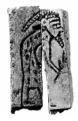 Two documents have been put forward as proof either Narmer or Hor-Aha was Menes. The first is the "Naqada Label" found at the site of Naqada, in the tomb of Queen Neithhotep, often assumed to have been the mother of Horus Aha.[17] The label shows a serekh of Hor-Aha next to an enclosure inside of which are symbols that have been interpreted by some scholars as the name "Menes". The second is the seal impression from Abydos that alternates between a serekh of Narmer and the chessboard symbol, "mn", which is interpreted as an abbreviation of Menes. Inconclusive arguments have been made with regard to each of these documents in favour of Narmer or Hor-Aha being Menes.[b]