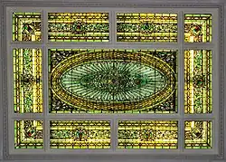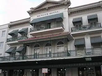 1. ^ Joe R. William; Marie D. Landon (December 10, 1976). "National Register of Historic Places Inventory-Nomination: Alamo Plaza Historic District" (PDF). Built in 1857 the Menger was originally a two-story limestone building designed by John Fries. Located at the southwest corner of the block the building later ex-panded to a three-story building at this corner. Alfred Giles is responsible for this later design. The west facade of the original building is now a three-story, three -bay structure. The slightly projecting central bay is crowned by a pedi-mented parapet. The first floor contains a central door flanked by two windows, while the second and third floors each contain three round arched openings. The end bays contain two flat arched windows on each floor and these pavilions are capped by a bracketed cornice. Iron balconies extend at the second and third floor levels. Additions to the north and east have been made several times in the 19th and 20th centuries and thehotel now fills the entire block. A lavish three-story space in the Menger lobby, illuminated by a stained glass, leaded skylight, dominates the old part of the hotel. The solid block of hotel buildings is broken in the center by an interior courtyard of walkways through dense tropical foliage. (PDF document also available here. Downloading may be slow..)