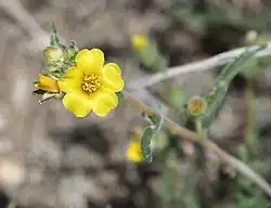 The inflorescence is a cluster of a few bright, shiny yellow flowers with round, slightly indented petals up to 1.5 centimeters long and sometimes marked with red near the bases. The fruit is a narrow, curving utricle up to 2.6 centimeters in length which contains many minute seeds which are bumpy under magnification.