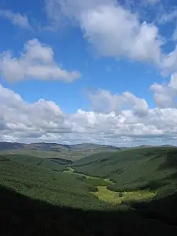 Menzion lies along the Menzion burn, being separated into Nether Menzion and Over Menzion. Nether Menzion lies at the foot of the burn near the Fruid road. The burn is surrounded on both sides by commercial forestry which is set back to reduce the immediate impact of the acidic run-off. Over Menzion, which was formerly a shepherd's abode, is now abandoned.
