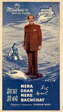 Mera Ghar Mere Bachche (transl. My home, my children) is a 1960 Indian Hindi-language social family drama film produced and directed by Sohrab Modi.[1][2] Made under the Minerva Movietone banner, it had music by Sardar Malik with lyrics by Hasrat Jaipuri.[3] The film had Naaz starring in an adult lead role after previously acting as a child star. She went on to marry her co-star in the film, Subiraj. It co-starred Sohrab Modi, Sulochana, Sudesh Kumar, Subiraj, Naaz, Daisy Irani and Nana Palsikar.[4]
