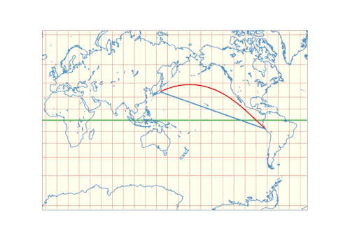 The animation below shows a continuous transformation between the normal Mercator projection and the transverse projection, running through the intermediate oblique states. A rhumb line (blue) and great circle (red) from Tokyo, Japan, to Callao, Peru, change according to the projection's aspect. The rhumb between them is straight only on the normal projection. On one of the intermediate oblique projections, the great-circle path between the two cities is straight. In this plot the y-axis is always the projected axis of the cylinder. The sphere is rotated inside the cylinder to change aspect. Initially the axis is normal to the equator (projected as the thick green line) but ends transverse to it, when the projected equator extends to infinity in the vertical direction.