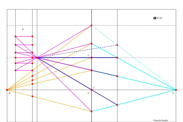 This nomogram is a real geometric calculator exactly representing the rotational speeds of the transmission's 3x4 = 12 internal shafts for each of its 9 ratios (+ reverse), grouped according to their 4 permanent coupling on 3 joint ordinates and 5 independent ordinates. These ordinates are positioned on the abscissa in strict accordance with the proportions of the sun gears' teeth numbers relative to those of their rings. Consequently, the output ratios on the 3rd ordinate (carrier of the third planetary gearset) follows closely those of the actual transmission. This advantageous geometric construction sets us free from Robert Willis' famous and tedious formula,[18] because all calculations are exclusively determined by lengths ratios, respectively teeth numbers on the abscissa for the 4 epicyclic ratios, and of rotational speeds on the 3rd ordinate for the 10 gear ratios.