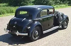 The result of putting a 4,400 mm (170 in) car body on the old 2,700 mm (110 in) was one or two very long overhangs: in the case of the 1937 W143 the overhang was concentrated at the back.[3] Whether because the excessive rear overhang looked rather odd, or for other reasons, the original W 143 failed to gain market acceptance, and although the short-wheelbase cars continued to be offered for sale until the end of 1937, well before that the model had effectively been relaunched with the longer 3,050 mm (120 in) wheelbase that had already been offered on special long-wheelbase version of the Mercedes Typ 200 (W 21) for several years.