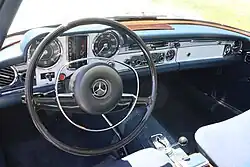 Other differences of the North American models include imperial gauges, chrome bumper guards, side reflectors (illuminated from 1970), lower rear-axle ratios for faster acceleration yet reduced top speeds, and no "single-side" parking lights. US market 280 SL engines required emission control modifications, including "softer" valve timings, a reduced compression ratio and a modified injection pump, which reduced power from 170 PS (125 kW; 168 hp) to 160 PS (118 kW; 158 hp).[8] In the US, automatic transmission, air conditioning, and white wall tires were much more popular than elsewhere.