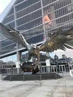 The stadium incorporates contemporary art into its interior and exterior design, with over 180 commissioned works, including pieces by Nari Ward, Hank Willis Thomas, Gregory Eltringham, and Steven and William Ladd. The centerpiece of the art collection is Gábor Miklós Szőke's stainless steel sculpture The Atlanta Falcon, which the artist said is the largest freestanding bird sculpture in the world. The falcon, perched atop a 13 foot (4.0 m) tall bronze football, is 41 feet (12 m) high with a wingspan of 70 feet (21 m). The sculpture stands in front of the stadium, weighs over 73,000 pounds (33,000 kg), and is as tall as a four-story building.[26]